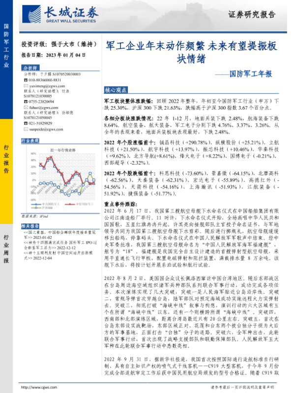 【长城证券】【20230104】20230104-长城证券-国防军工年报:军工企业年末动作频繁 未来有望提振板块情绪-15页