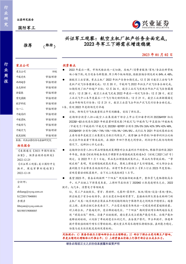 【兴业证券】【20230102】兴证军工观察:航空主机厂批产任务全面完成,2023年军工下游需求增速稳健-24页