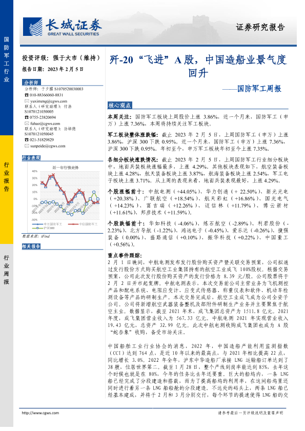 【长城证券】【20230205】20230205-长城证券-国防军工周报:歼-20“飞进”A股,中国造船业景气度回升-12页