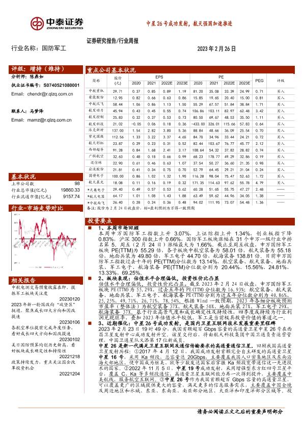 【中泰证券】【20230226】中泰证券-国防军工行业周报:中星26号成功发射,航天强国加速推进-20页