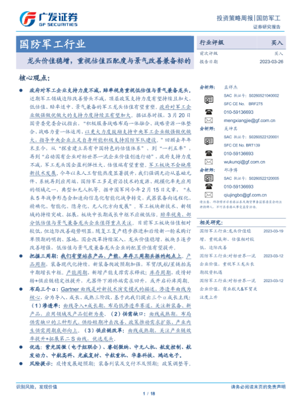 【广发证券】【20230326】20230326-广发证券-国防军工行业投资策略周报:龙头价值稳增,重视估值匹配度与景气改善兼备标的-18页