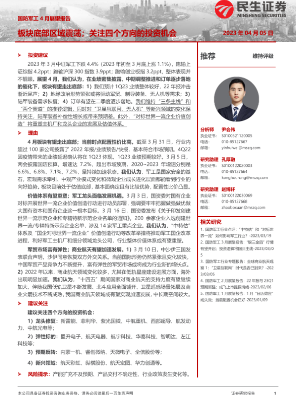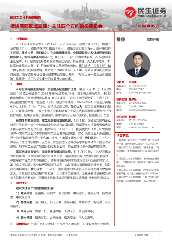 【民生证券】【20230405】20230405-民生证券-国防军工4月展望报告:板块底部区域震荡;关注四个方向的投资机会-16页