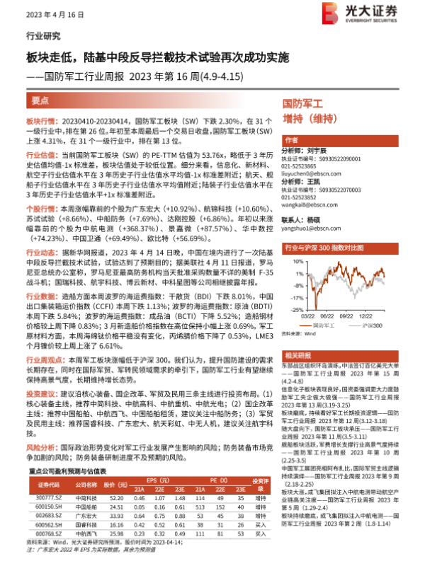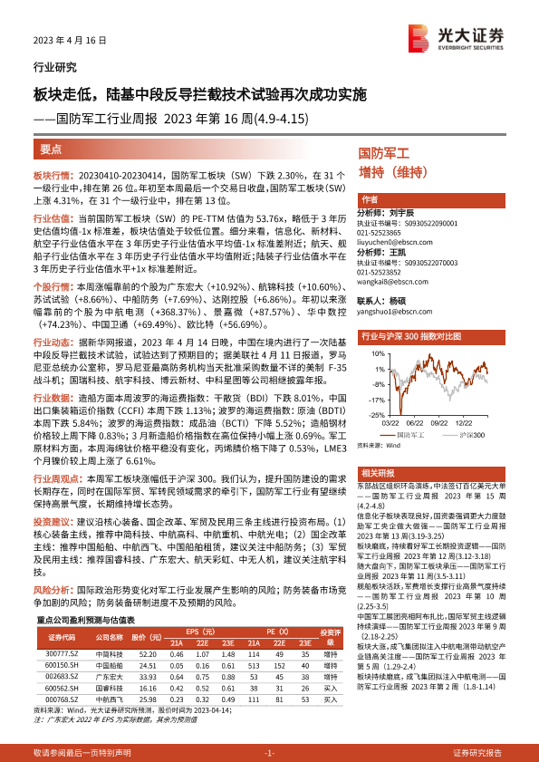 【光大证券】【20230416】国防军工行业周报2023年第16周:板块走低,陆基中段反导拦截技术试验再次成功实施-15页