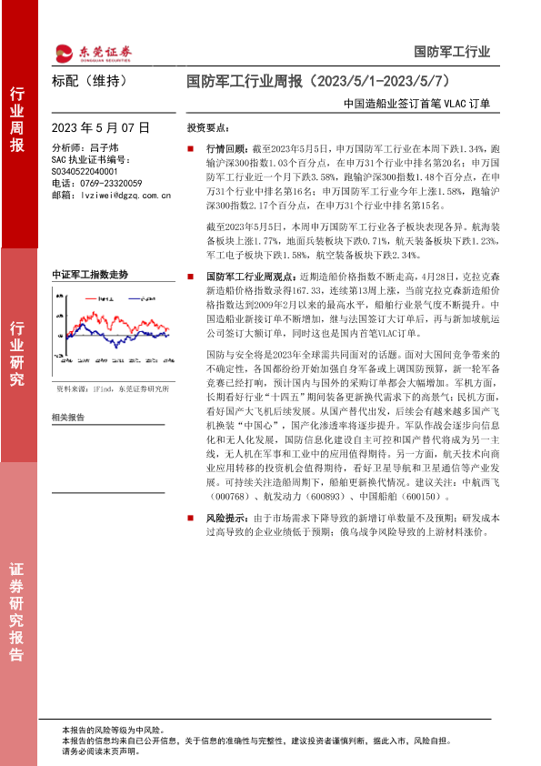 【东莞证券】【20230507】20230507-东莞证券-国防军工行业周报:中国造船业签订首笔VLAC订单-10页