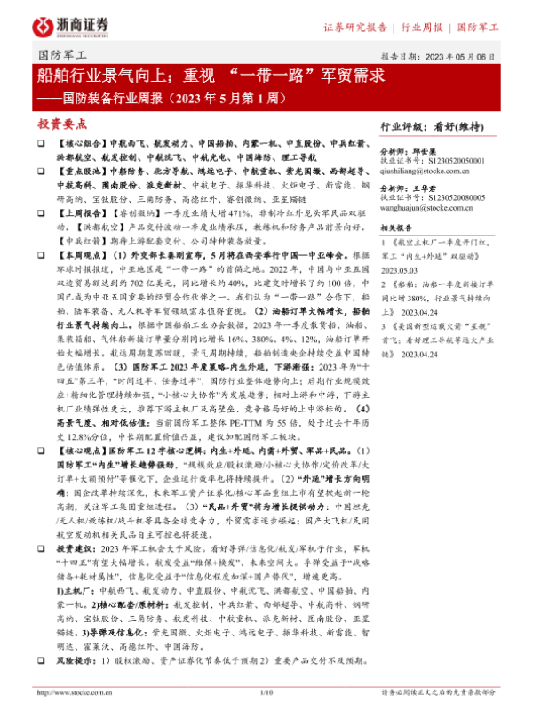 【浙商证券】【20230506】国防装备行业周报(2023年5月第1周):船舶行业景气向上;重视 “一带一路”军贸需求-10页
