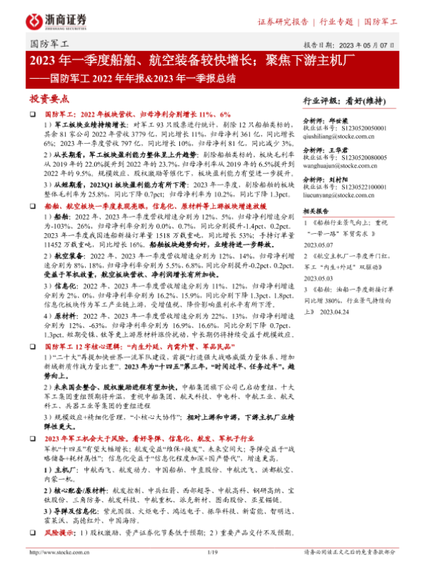 【浙商证券】【20230507】国防军工2022年年报&2023年一季报总结:2023年一季度船舶、航空装备较快增长;聚焦下游主机厂-19页