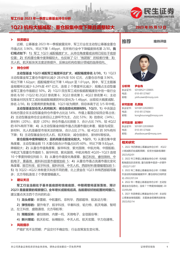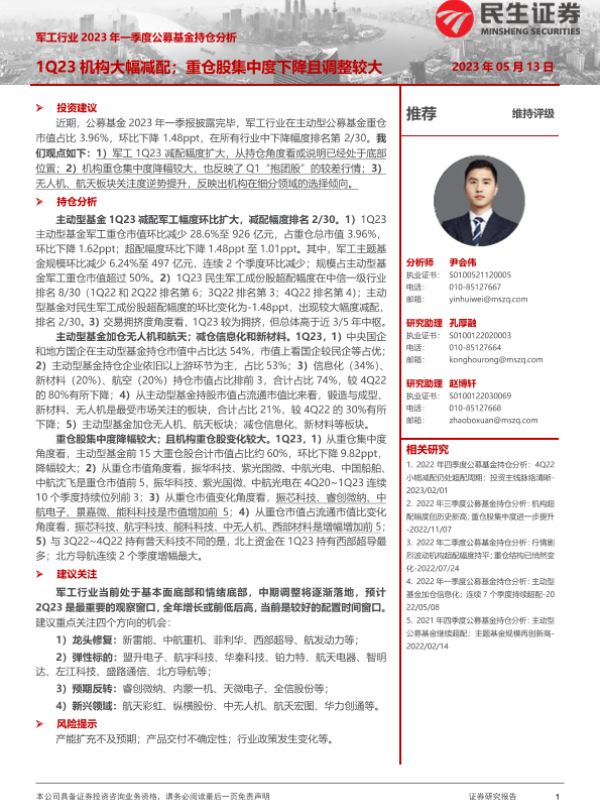 【民生证券】【20230513】军工行业2023年一季度公募基金持仓分析:1Q23机构大幅减配;重仓股集中度下降且调整较大-17页