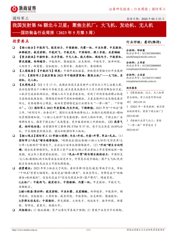 【浙商证券】【20230521】国防装备行业周报(2023年5月第3周):我国发射第56颗北斗卫星;聚焦主机厂:大飞机、发动机、无人机-11页