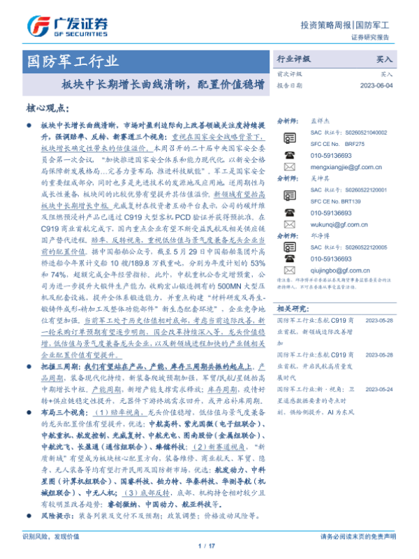 【广发证券】【20230604】20230604-广发证券-国防军工行业投资策略周报:板块中长期增长曲线清晰,配置价值稳增-17页