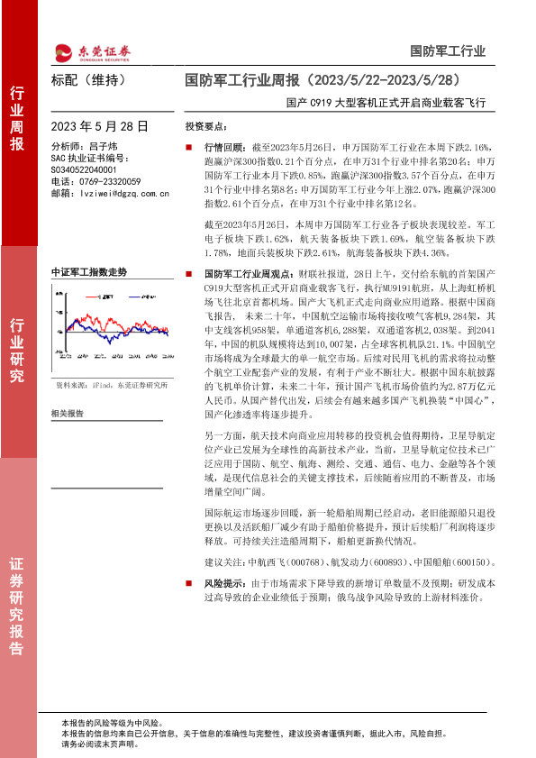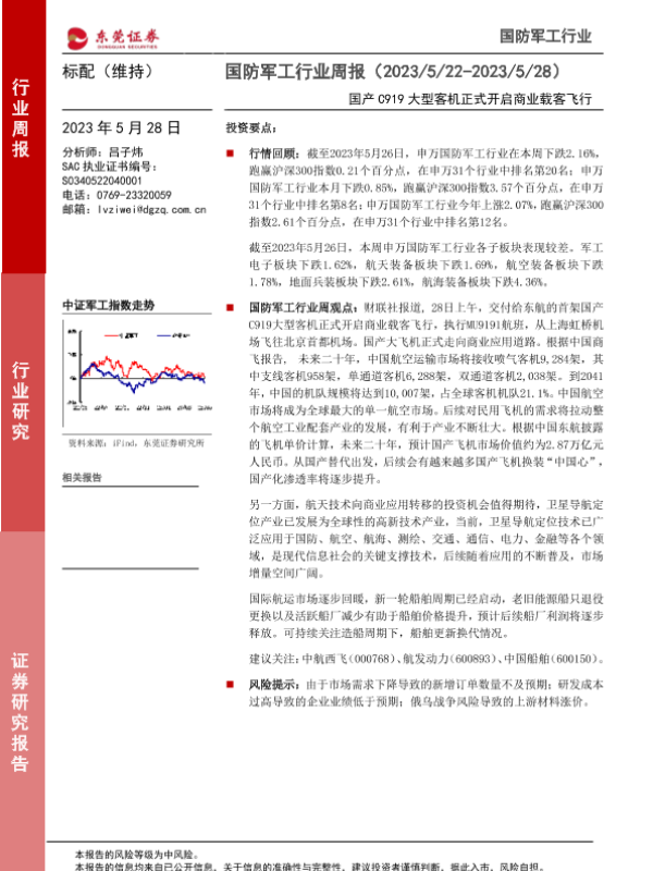 【东莞证券】【20230528】20230528-东莞证券-国防军工行业周报:国产C919大型客机正式开启商业载客飞行-11页