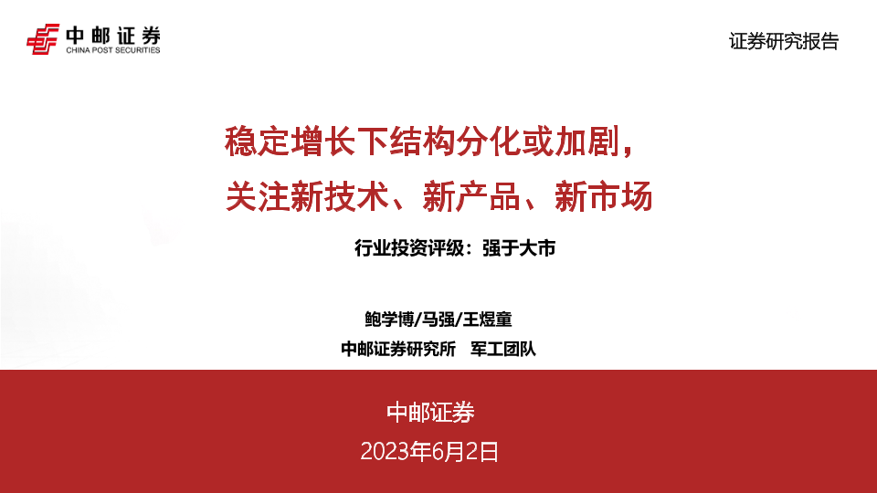 【中邮证券】【20230602】20230602-中邮证券-军工行业中期策略:稳定增长下结构分化或加剧,关注新技术、新产品、新市场-33页