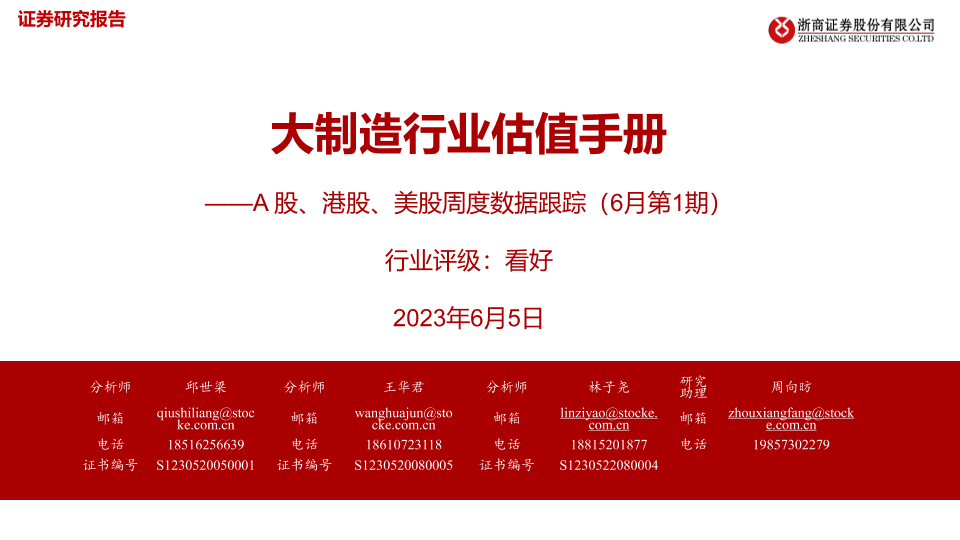 【浙商证券】【20230605】大制造行业估值手册:A股、港股、美股周度数据跟踪(6月第1期)-39页