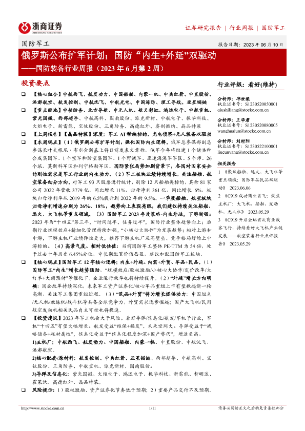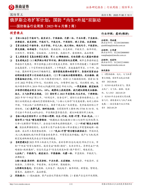 【浙商证券】【20230610】国防装备行业周报(2023年6月第2周):俄罗斯公布扩军计划;国防“内生+外延”双驱动-11页