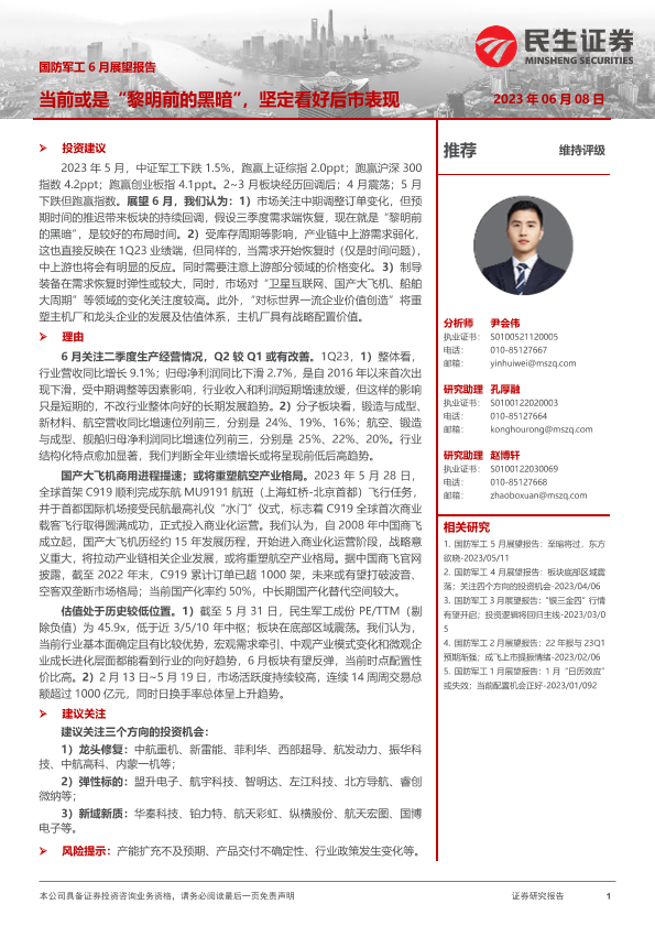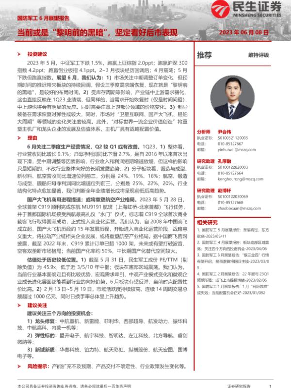 【民生证券】【20230608】20230608-民生证券-国防军工6月展望报告:当前或是“黎明前的黑暗”,坚定看好后市表现-16页