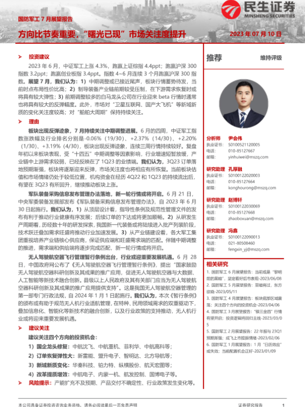 【民生证券】【20230710】国防军工7月展望报告:方向比节奏重要,“曙光已现”市场关注度提升-16页