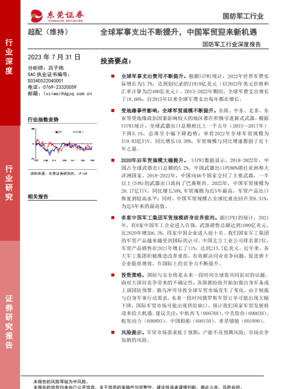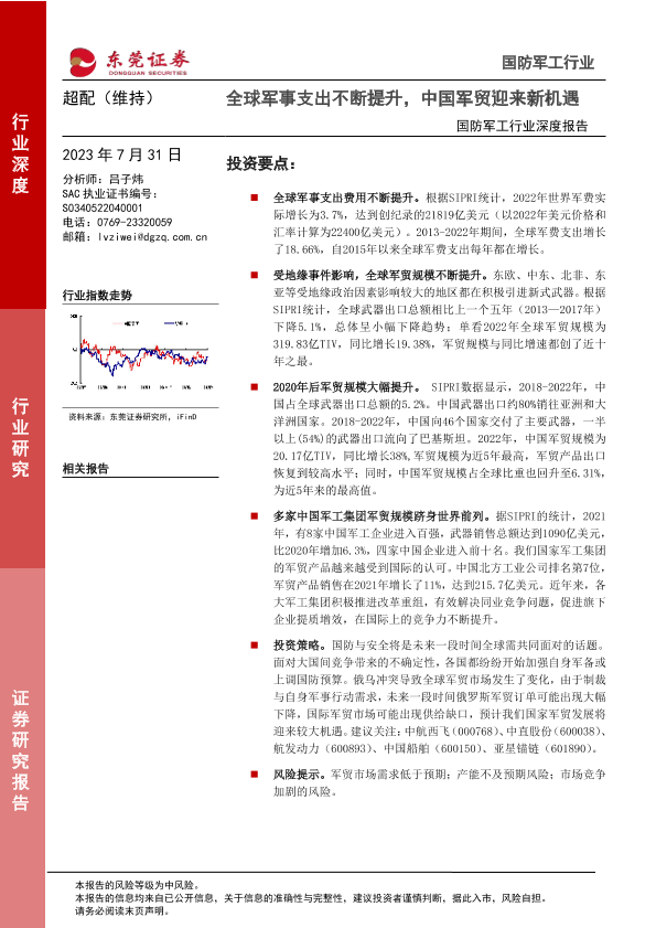 【东莞证券】【20230731】20230731-东莞证券-国防军工行业深度报告:全球军事支出不断提升,中国军贸迎来新机遇-12页