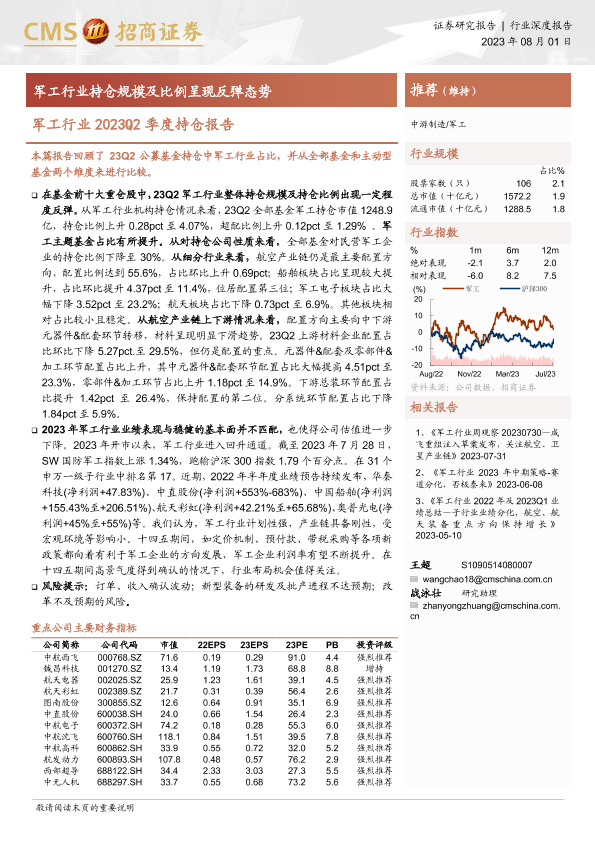 【海通证券】【20230801】军工行业2023Q2季度持仓报告:军工行业持仓规模及比例呈现反弹态势-14页