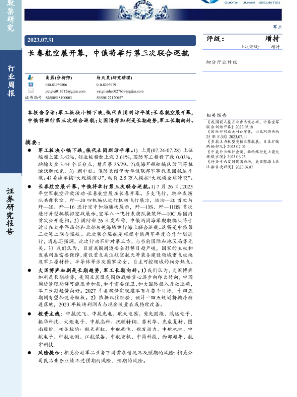 【国泰君安证券】【20230731】20230731-国泰君安-军工行业周报:长春航空展开幕,中俄将举行第三次联合巡航-11页