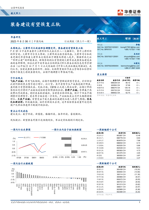 【华泰证券】【20230806】航天军工行业周报(第三十一周):装备建设有望恢复正轨-13页