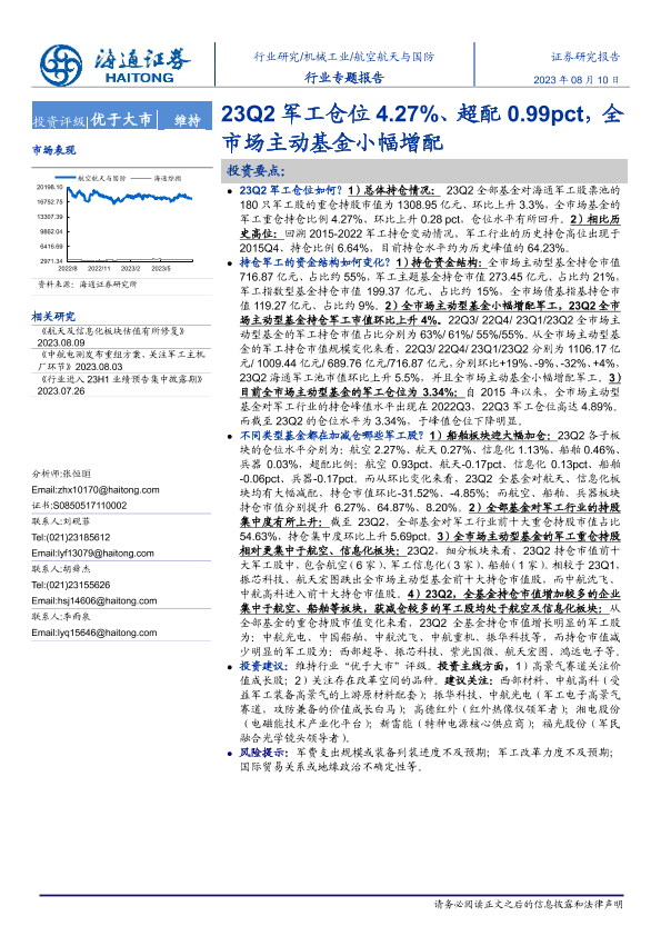 【海通证券】【20230810】23Q2军工仓位4.27%、超配0.99pct,全市场主动基金小幅增配-19页