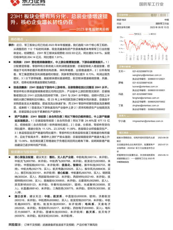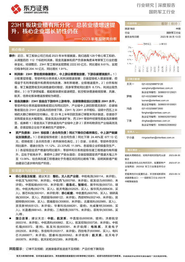 【东方证券】【20230913】国防军工行业2023半年报财务分析:23H1板块业绩有所分化,总装业绩增速提升,核心企业增长韧性仍在-28页