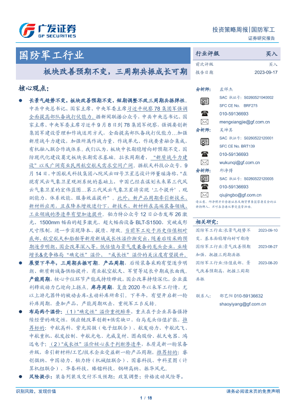 【广发证券】【20230917】20230917-广发证券-国防军工行业投资策略周报:板块改善预期不变,三周期共振成长可期-18页