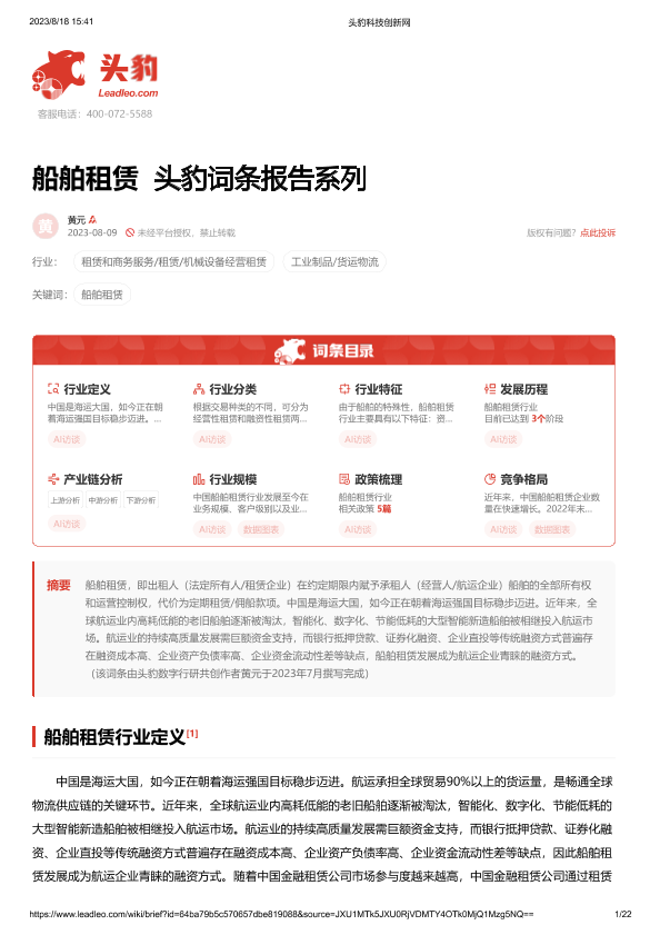 【头豹研究院】【20230809】船舶租赁 头豹词条报告系列-22页