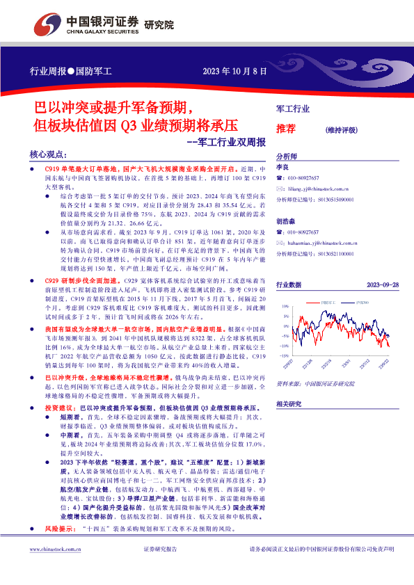 【银河证券】【20231008】20231008-中国银河-军工行业双周报:巴以冲突或提升军备预期,但板块估值因Q3业绩预期将承压-16页