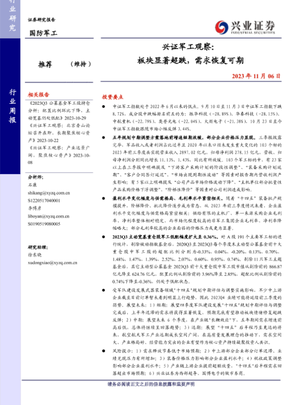 【兴业证券】【20231106】兴证军工观察:板块显著超跌,需求恢复可期-35页
