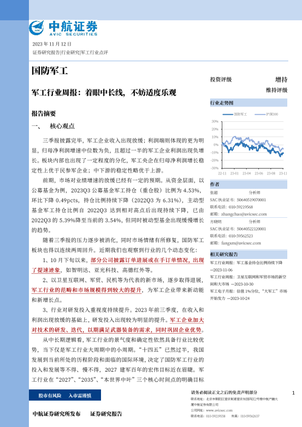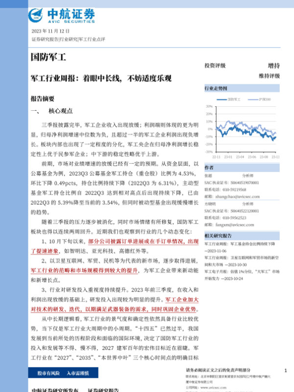 【中航证券】【20231112】20231112-中航证券-军工行业周报:着眼中长线,不妨适度乐观-23页