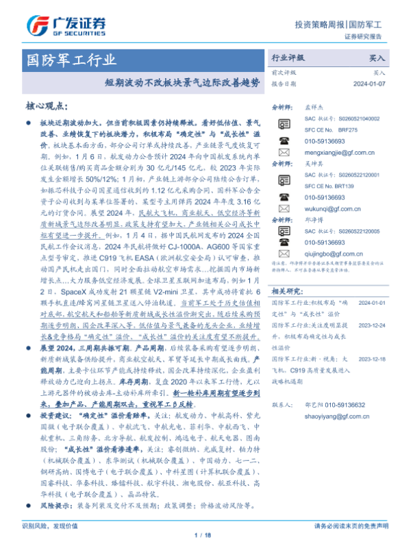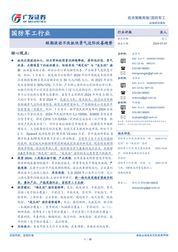 【广发证券】【20240107】国防军工行业:短期波动不改板块景气边际改善趋势-18页