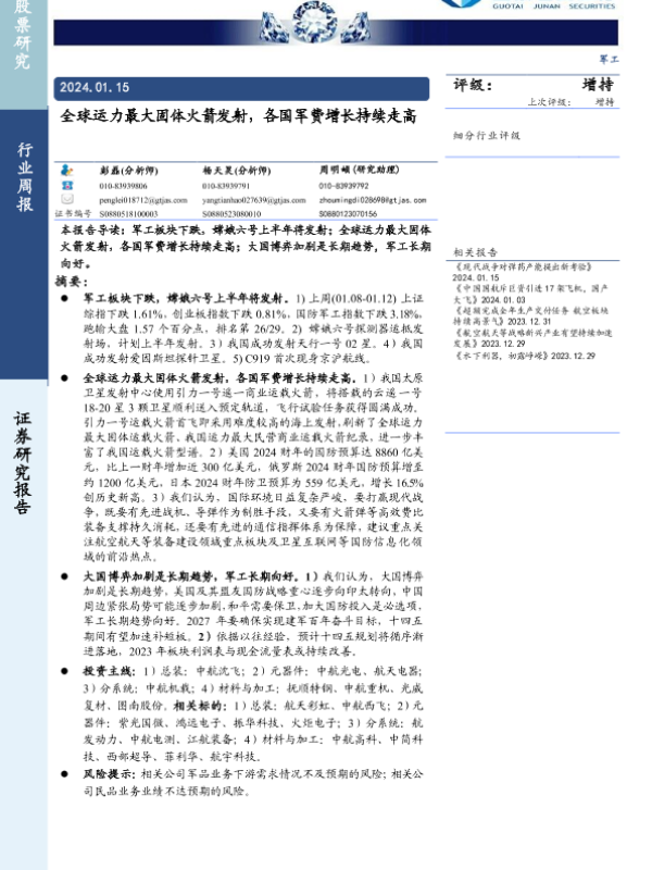 【国泰君安证券】【20240115】20240115-国泰君安-军工行业周报:全球运力最大固体火箭发射,各国军费增长持续走高-13页