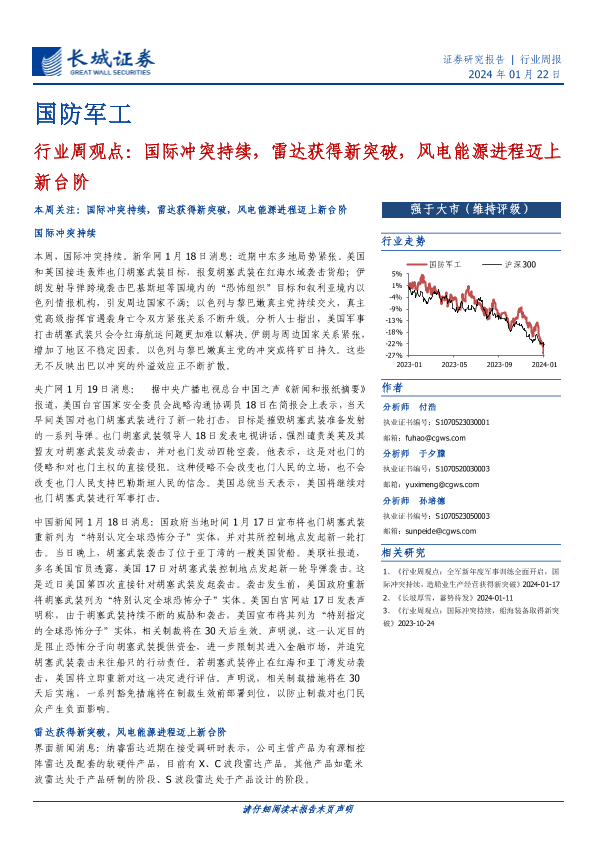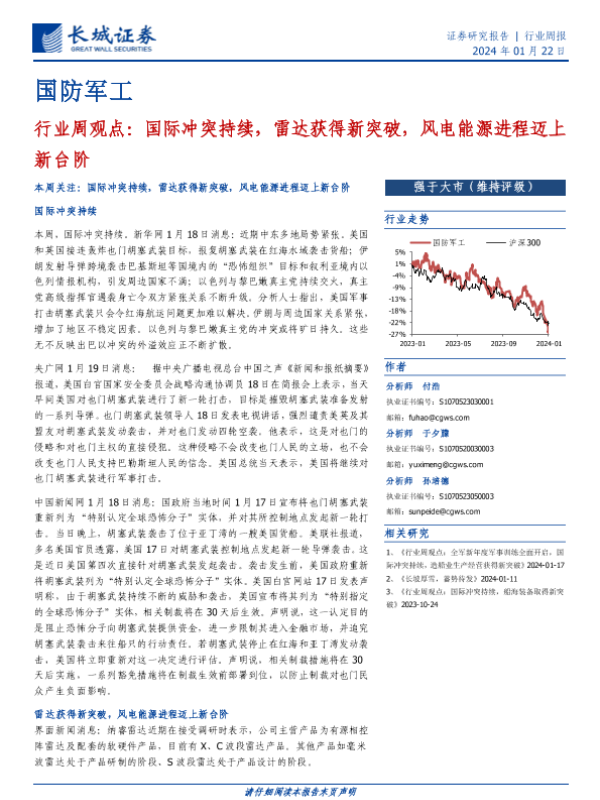 【长城证券】【20240122】国防军工行业周观点:国际冲突持续,雷达获得新突破,风电能源进程迈上新台阶-18页