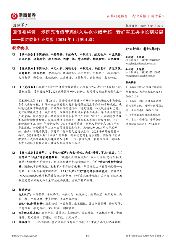 【浙商证券】【20240127】国防装备行业周报(2024年1月第4周):国资委将进一步研究市值管理纳入央企业绩考核,看好军工央企长期发展-10页