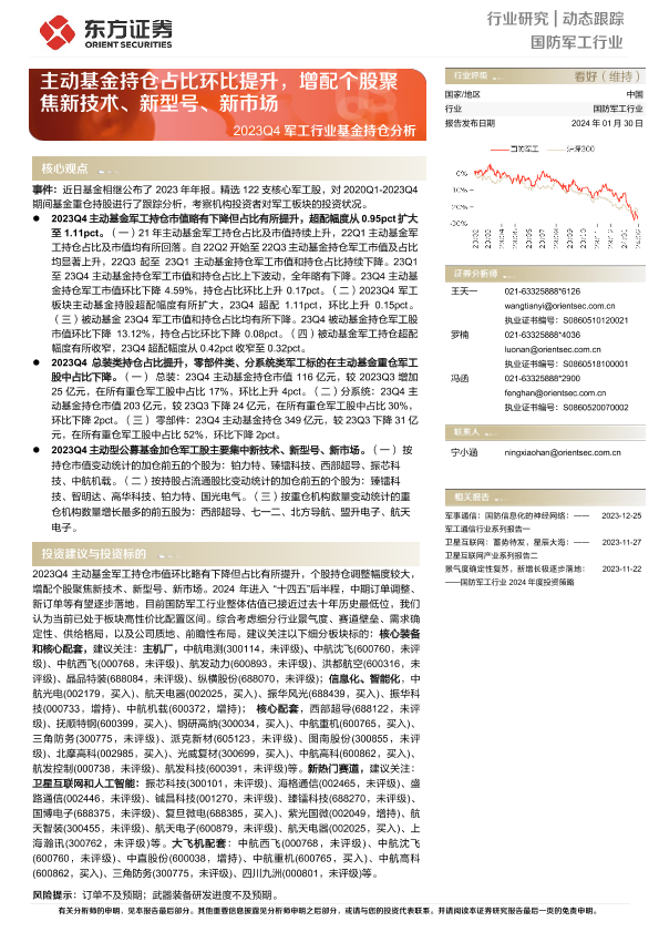 【东方证券】【20240130】2023Q4军工行业基金持仓分析:主动基金持仓占比环比提升,增配个股聚焦新技术、新型号、新市场-13页