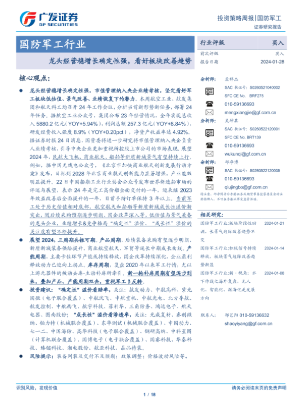 【广发证券】【20240128】国防军工行业:龙头经营稳增长确定性强,看好板块改善趋势-18页