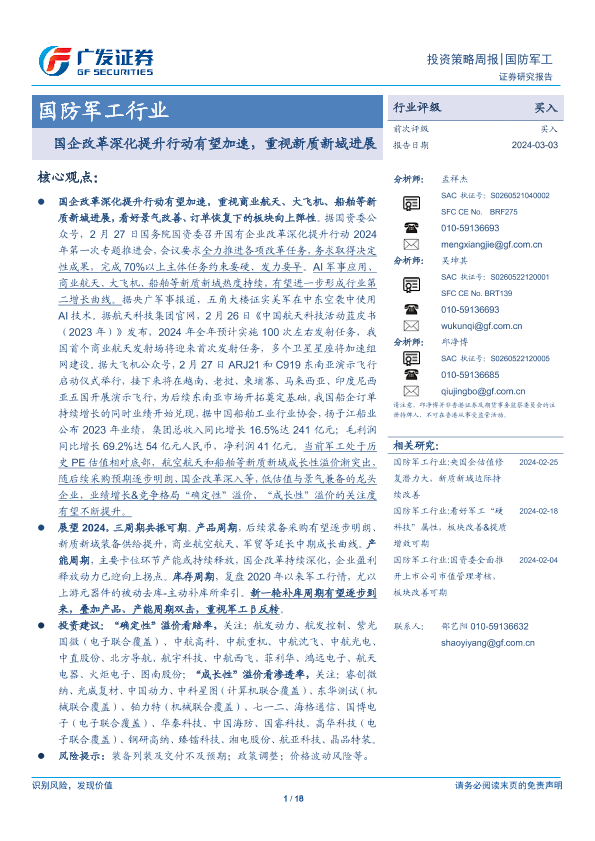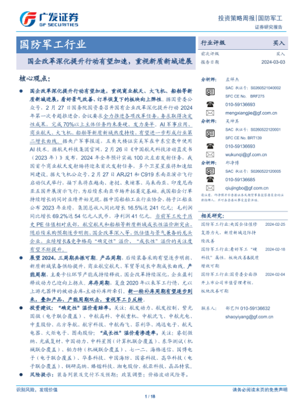 【广发证券】【20240303】20240303-广发证券-国防军工行业投资策略周报:国企改革深化提升行动有望加速,重视新质新域进展-18页