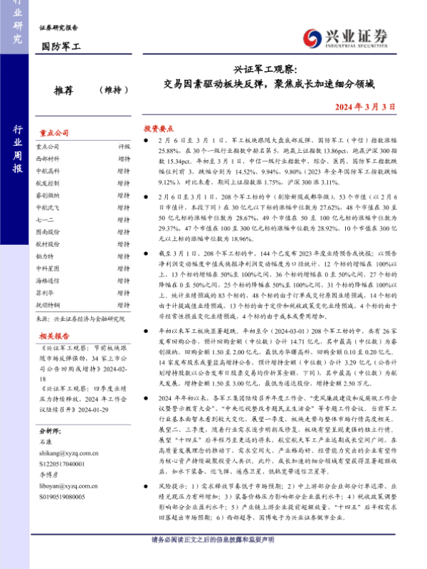【兴业证券】【20240303】兴证军工观察:交易因素驱动板块反弹,聚焦成长加速细分领域-24页