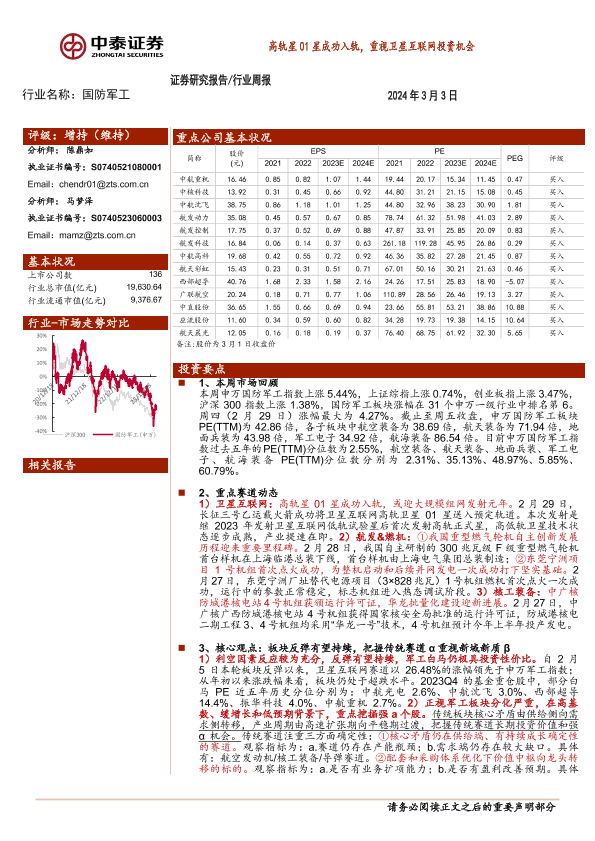 【中泰证券】【20240303】20240303-中泰证券-国防军工行业周报:高轨星01星成功入轨,重视卫星互联网投资机会-20页
