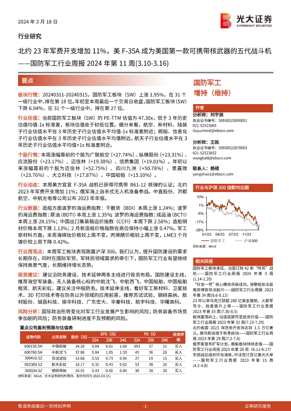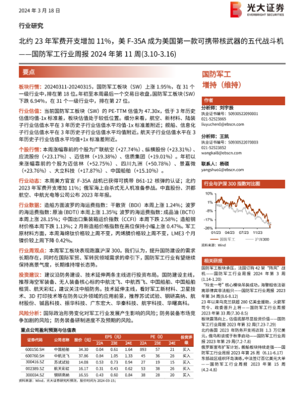 【光大证券】【20240318】国防军工行业周报2024年第11周:北约23年军费开支增加11%,美F-35A成为美国第一款可携带核武器的五代战斗机-17页