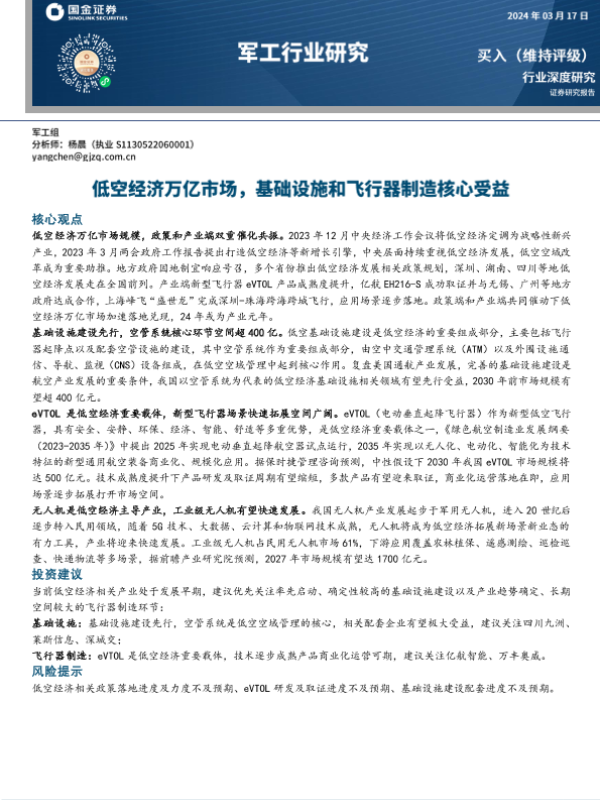 【国金证券】【20240317】20240317-国金证券-军工行业研究:低空经济万亿市场,基础设施和飞行器制造核心受益-28页