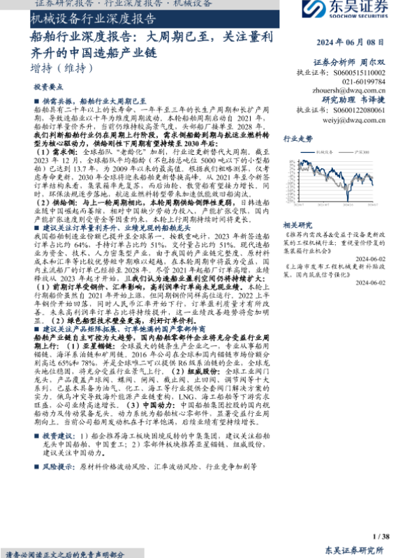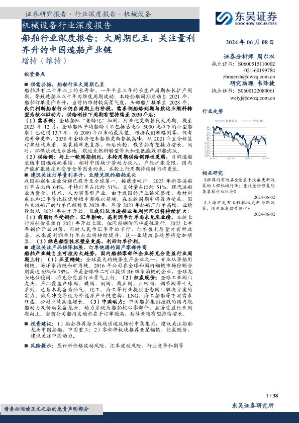 【东吴证券】【20240608】20240608-东吴证券-机械设备行业深度报告:船舶行业深度报告:大周期已至,关注量利齐升的中国造船产业链-38页