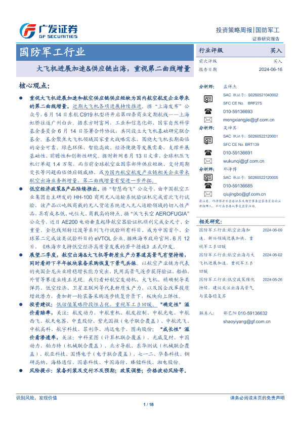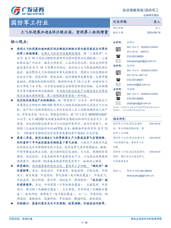 【广发证券】【20240616】国防军工行业投资策略周报:大飞机进展加速&供应链出海,重视第二曲线增量-18页