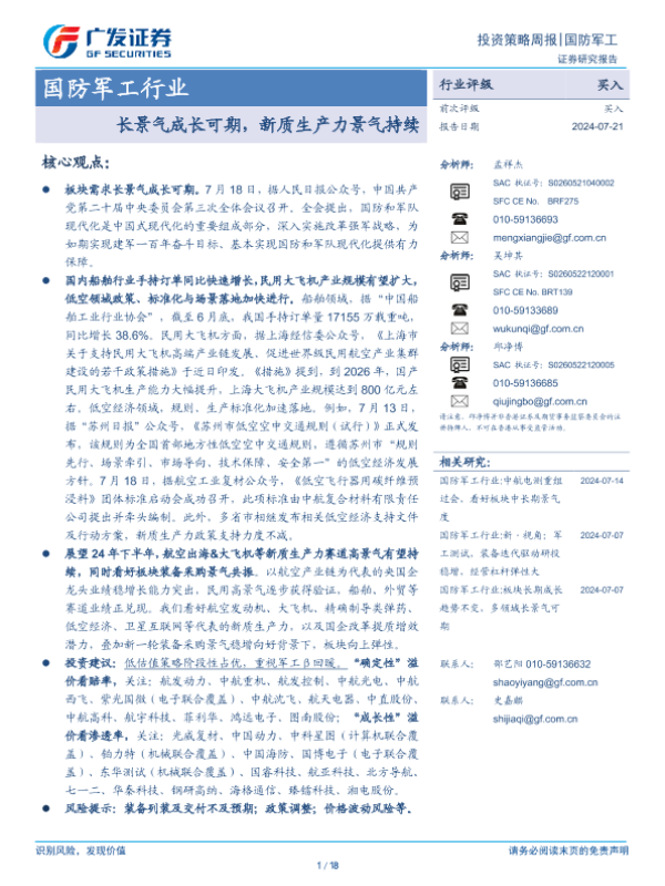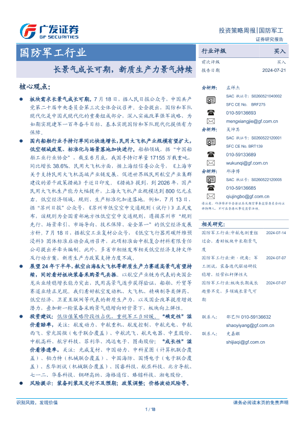 【广发证券】【20240721】20240721-广发证券-国防军工行业投资策略周报:长景气成长可期,新质生产力景气持续-18页