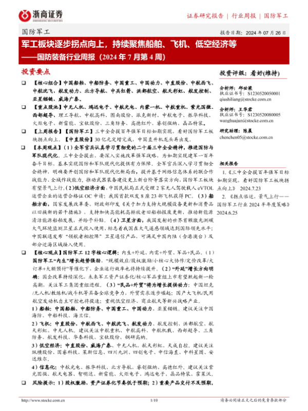 【浙商证券】【20240726】国防装备行业周报(2024年7月第4周):军工板块逐步拐点向上,持续聚焦船舶、飞机、低空经济等-10页