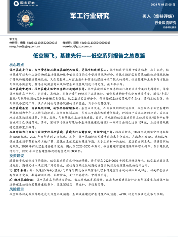 【国金证券】【20240805】20240805-国金证券-军工行业研究:低空腾飞,基建先行一一低空系列报告之总览篇-21页