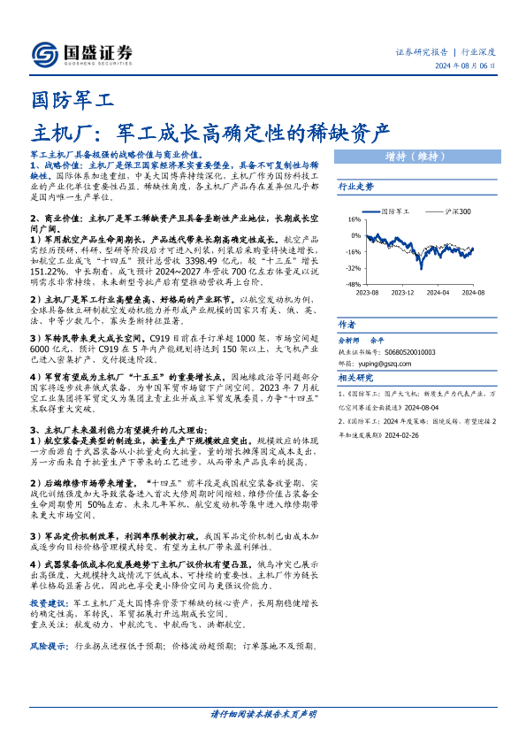 【国盛证券】【20240806】国防军工行业深度:主机厂:军工成长高确定性的稀缺资产-12页