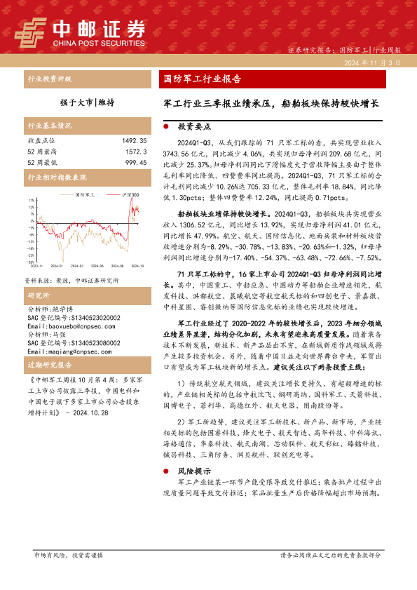 【中邮证券】【20241103】国防军工行业报告:军工行业三季报业绩承压,船舶板块保持较快增长-16页