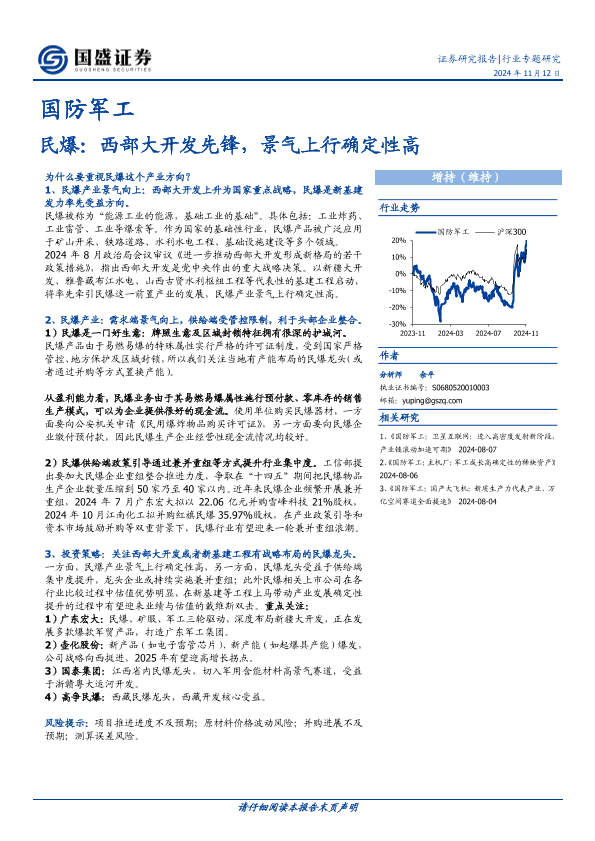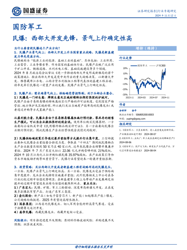 【国盛证券】【20241112】国防军工行业专题研究:民爆:西部大开发先锋,景气上行确定性高-10页