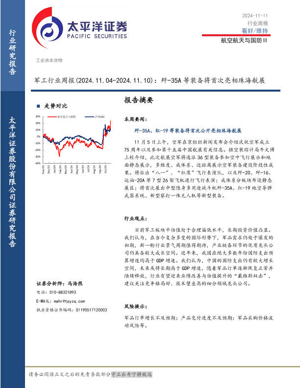 【太平洋证券】【20241111】20241111-太平洋-军工行业周报:歼-35A等装备将首次亮相珠海航展-13页
